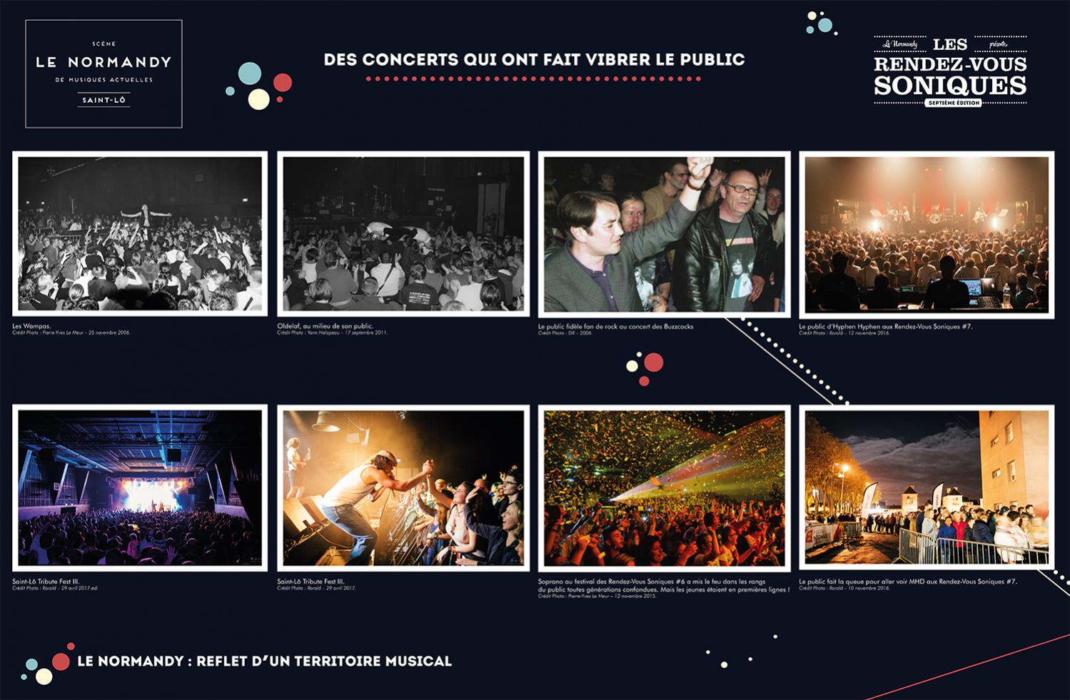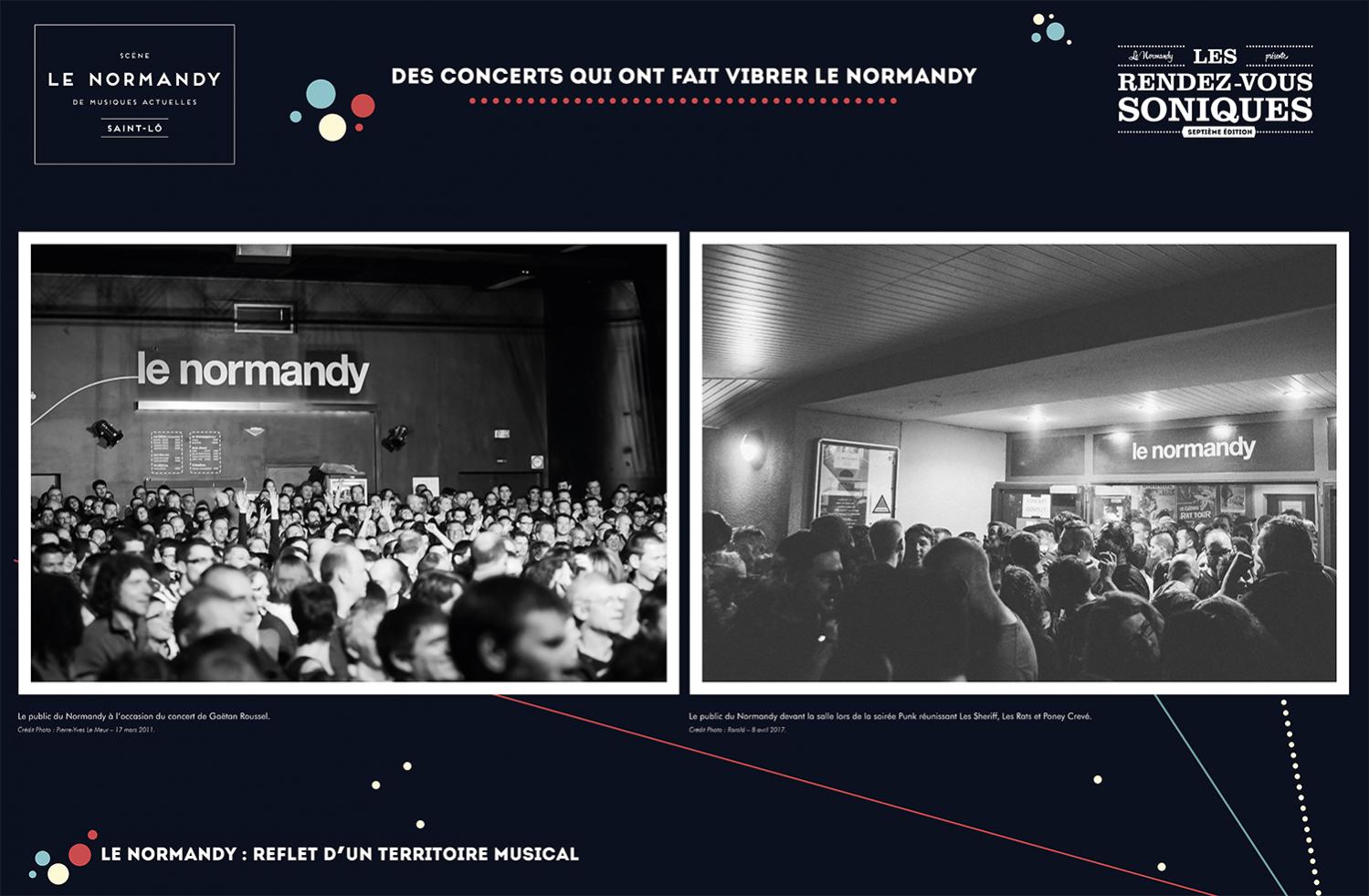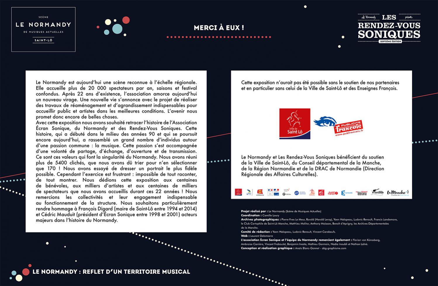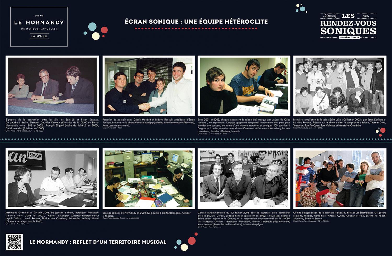 L’exposition retrace l’histoire de l’Association Écran Sonique, du Normandy et des Rendez-Vous Soniques. Cette histoire qui a débuté dans le milieu des années 90 et se poursuit encore aujourd’hui, a rassemblé un grand nombre d’individus autour d’une passion commune : la musique. Nous avons essayé de dresser un portrait le plus fidèle possible de ces 22 ans, cependant l’exercice est frustrant : impossible de tout raconter, de tout montrer.