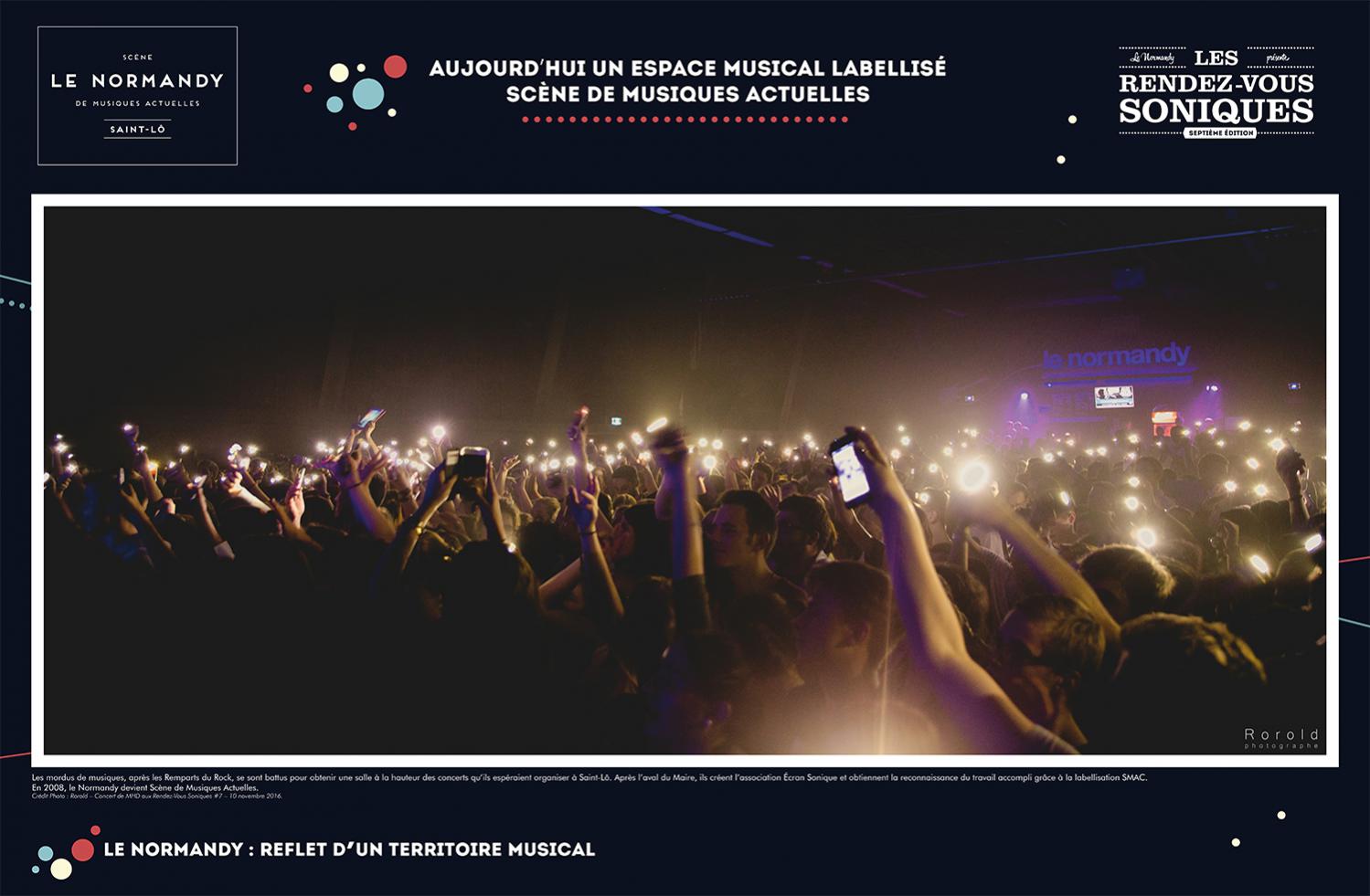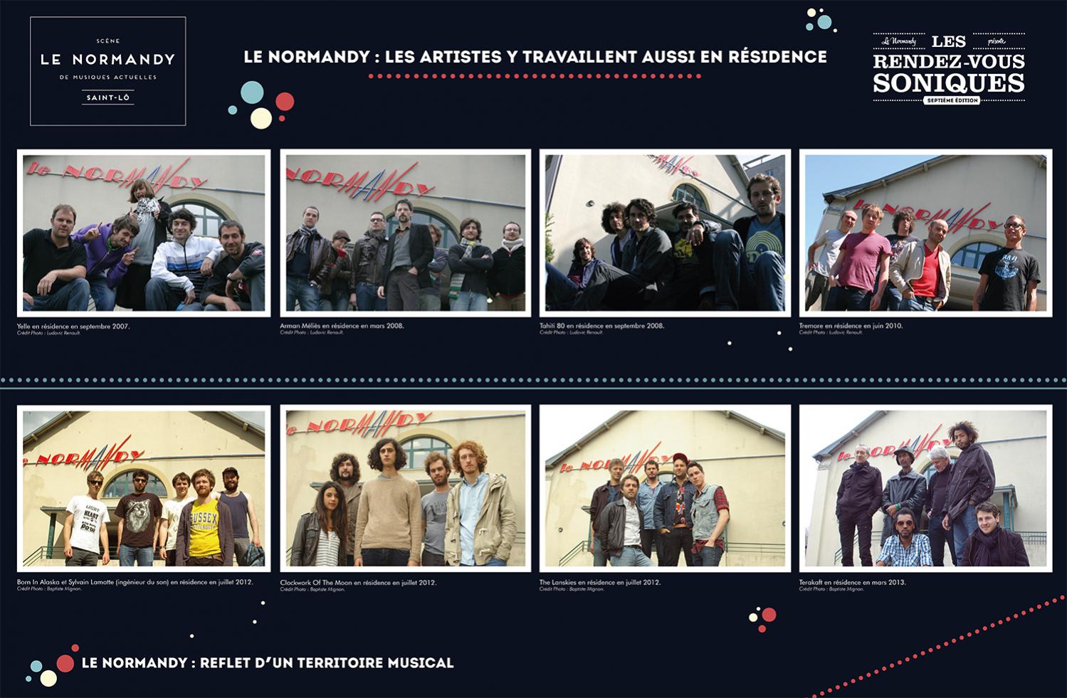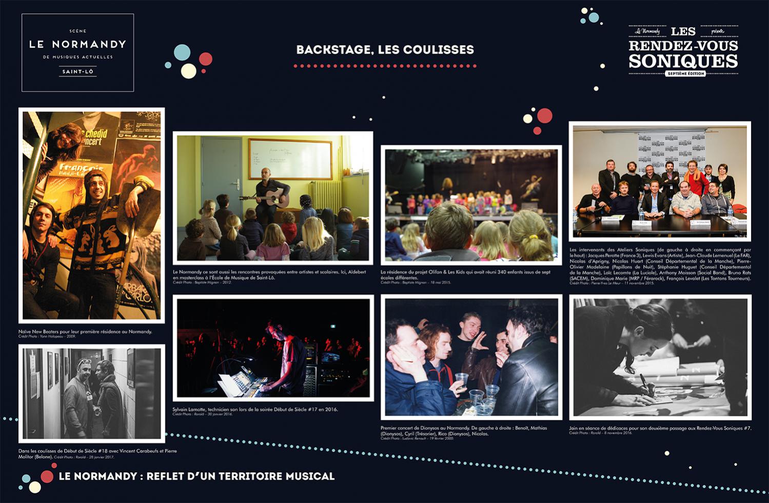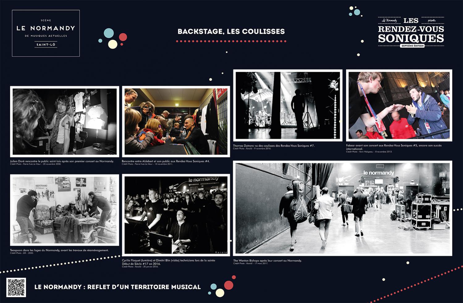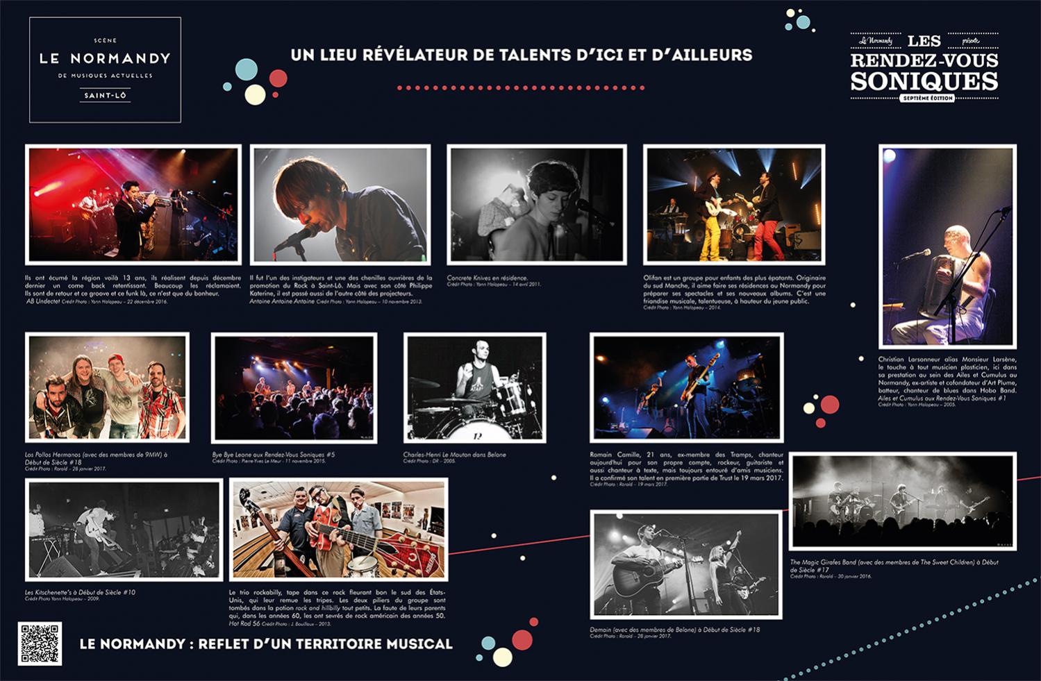 L’exposition retrace l’histoire de l’Association Écran Sonique, du Normandy et des Rendez-Vous Soniques. Cette histoire qui a débuté dans le milieu des années 90 et se poursuit encore aujourd’hui, a rassemblé un grand nombre d’individus autour d’une passion commune : la musique. Nous avons essayé de dresser un portrait le plus fidèle possible de ces 22 ans, cependant l’exercice est frustrant : impossible de tout raconter, de tout montrer.