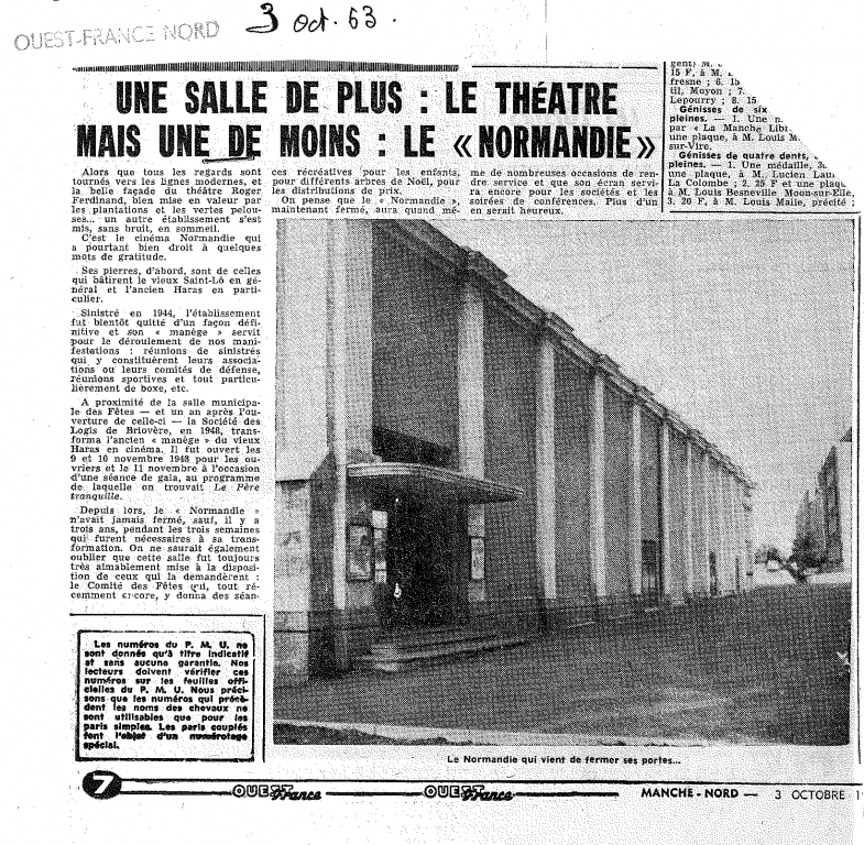 Un des seuls bâtiments épargnés lors des bombardements de 1944 qui détruisent Saint-Lô à 95%, La reconstruction sonne la fin du manège, il devient un bâtiment municipal. Et dès 1948 sous une impulsion ouvrière, le cinéma Le Normandie ouvre ses portes, et les ferme dans les années 80. Elle est alors utilisée pour des événements ponctuels et laissé à la disposition des jeunes.